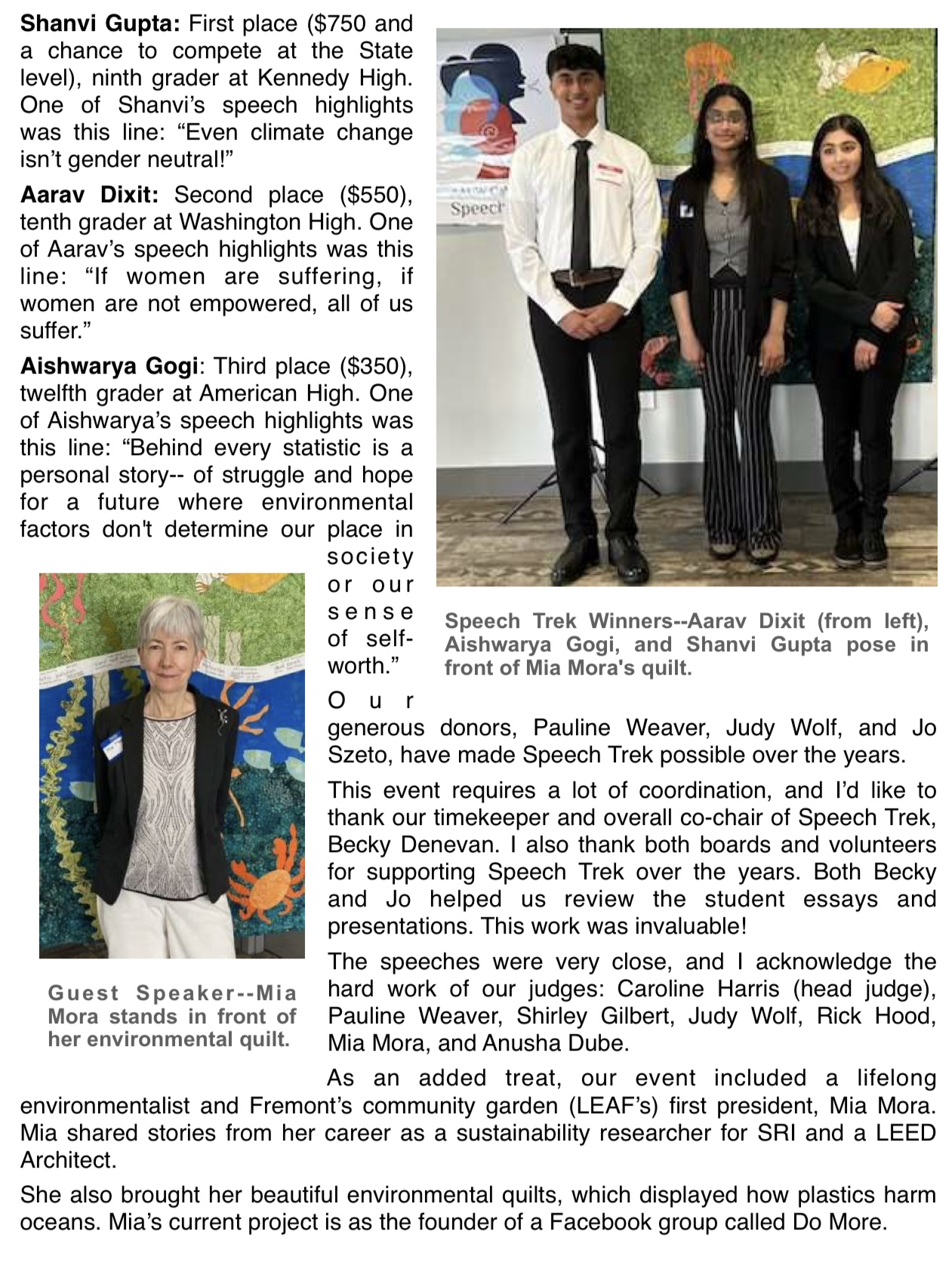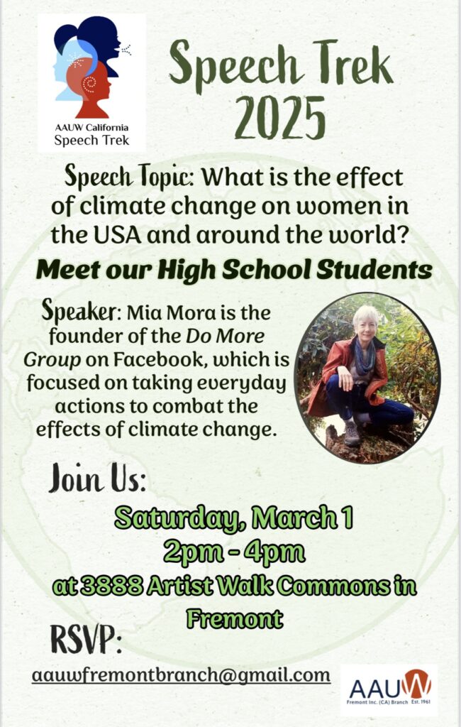 AAUW California Speech TrekSpeech Trek is AAUW California’s signature program for high school students. It begins at the branch level with a speech tournament for local students and culminates with three top statewide finalists delivering their five- to six-minute speeches at the AAUW California convention/annual meeting in April. Learn more about it HERE
